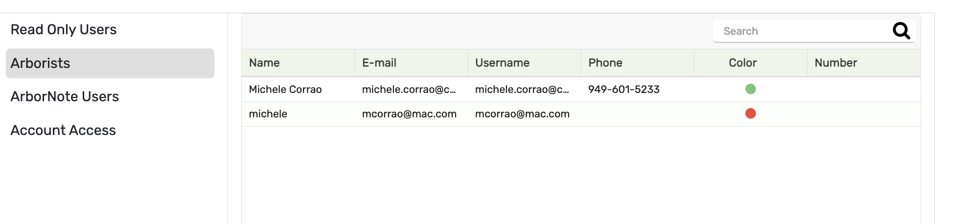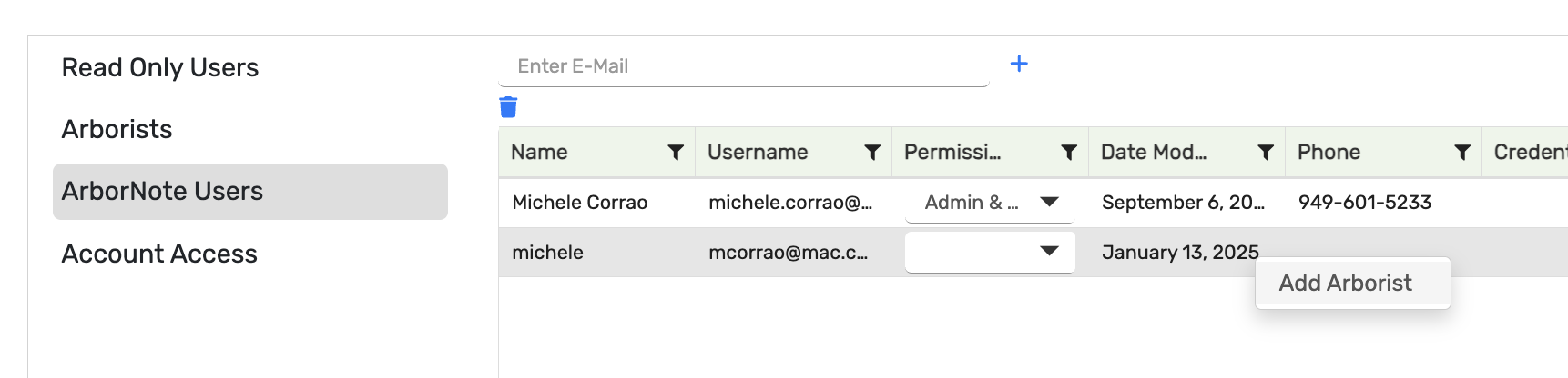 To add a Arborist - Go to the ArborNote Users tab and right click on the user to assign them as an arborist and assign a calendar display color.