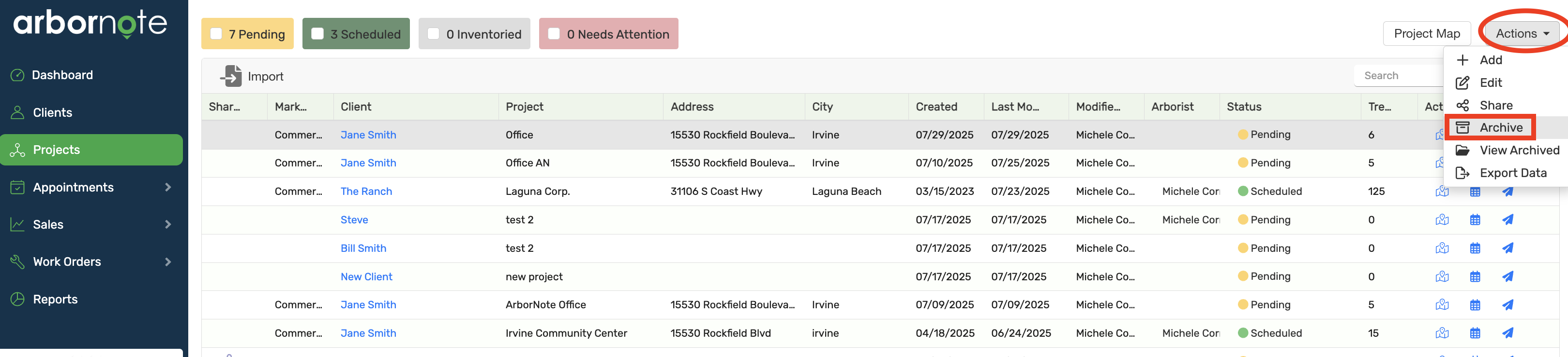 Note: ArborNote does not permanently delete projects. If you wish to remove a project from your list use the archive feature.