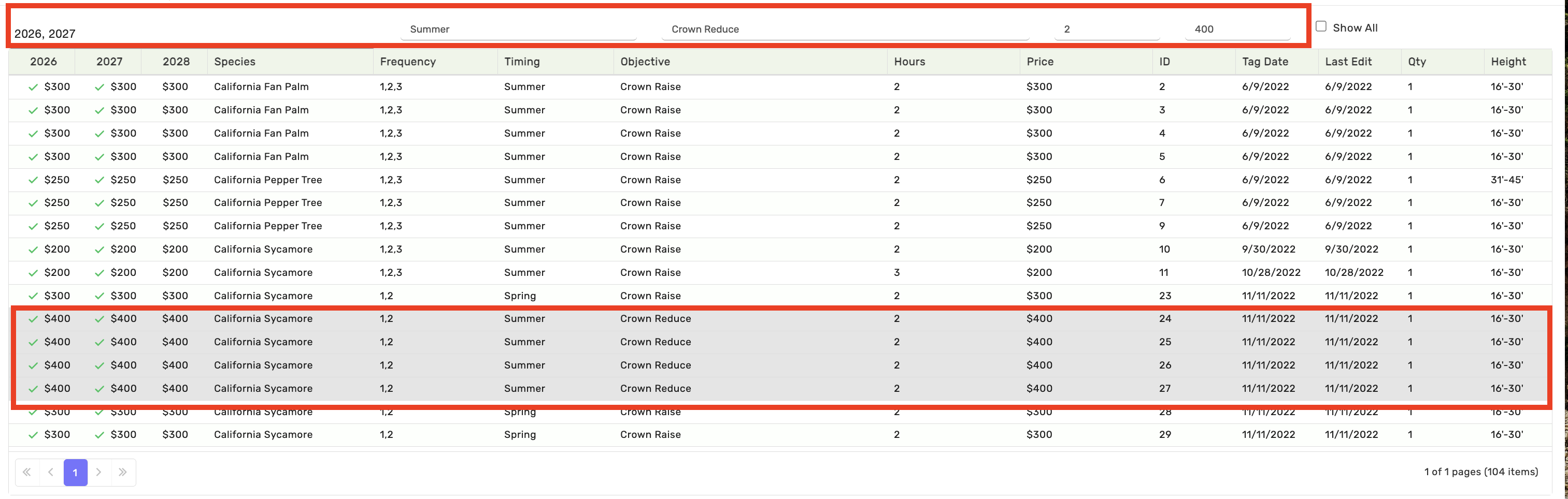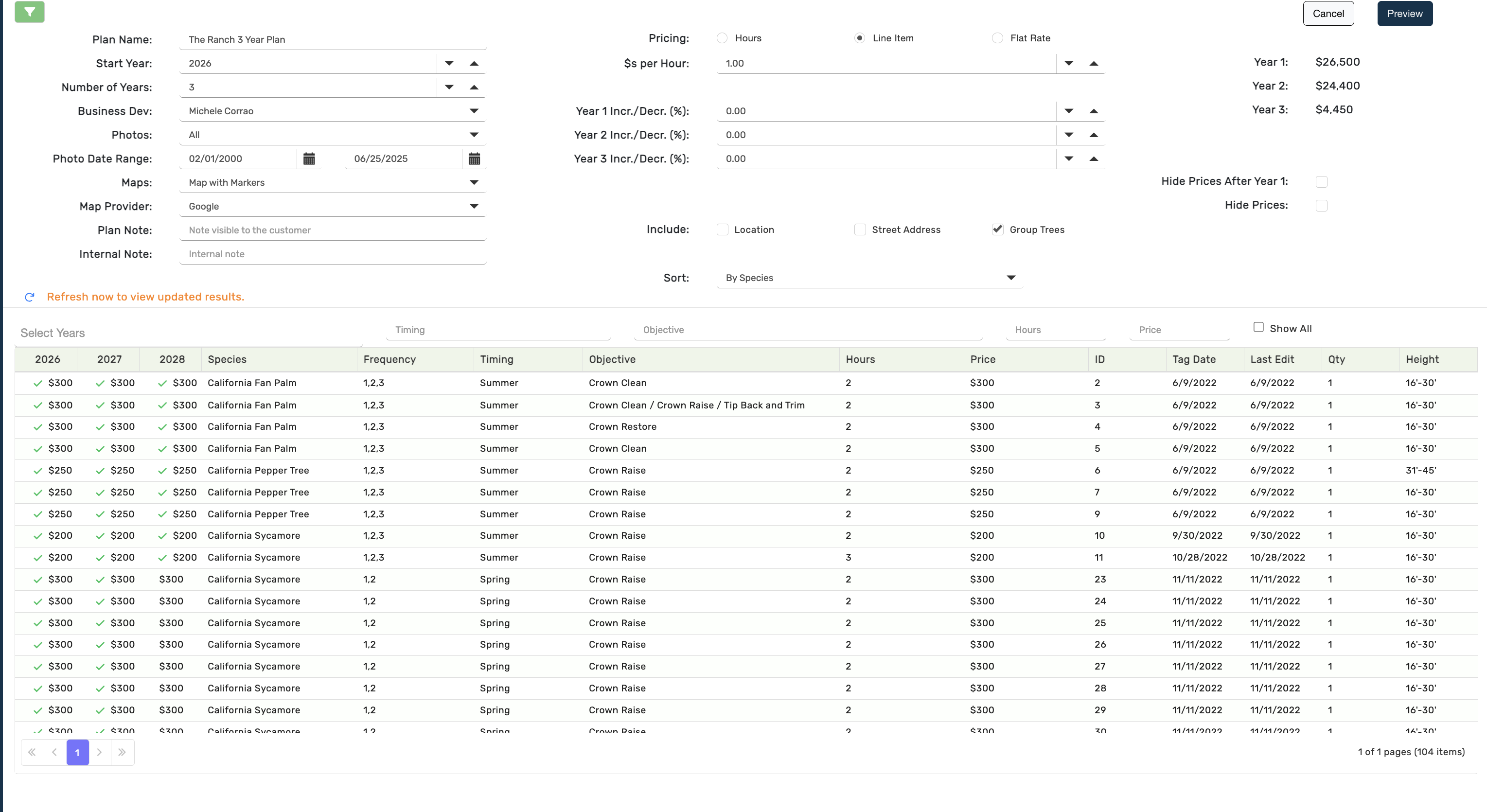 Helpful Tip: Before creating your plan - use the 'Frequency' field to enter the years you would like each tree to be included in the plan. Format Examples: 1,2,3,4,5 or 1,3. Use the 'Edit Highlighted' feature to bulk update frequencies.