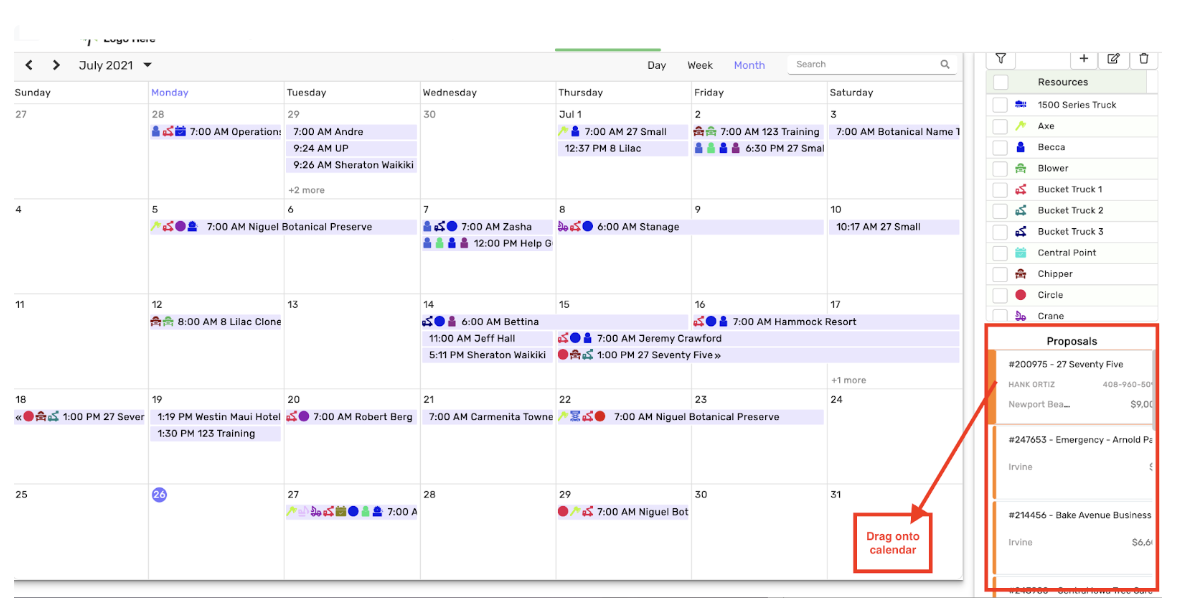 4. Drag and drop the proposal you would like to schedule a Work Order for by going into the calendar from the bottom right of the screen.