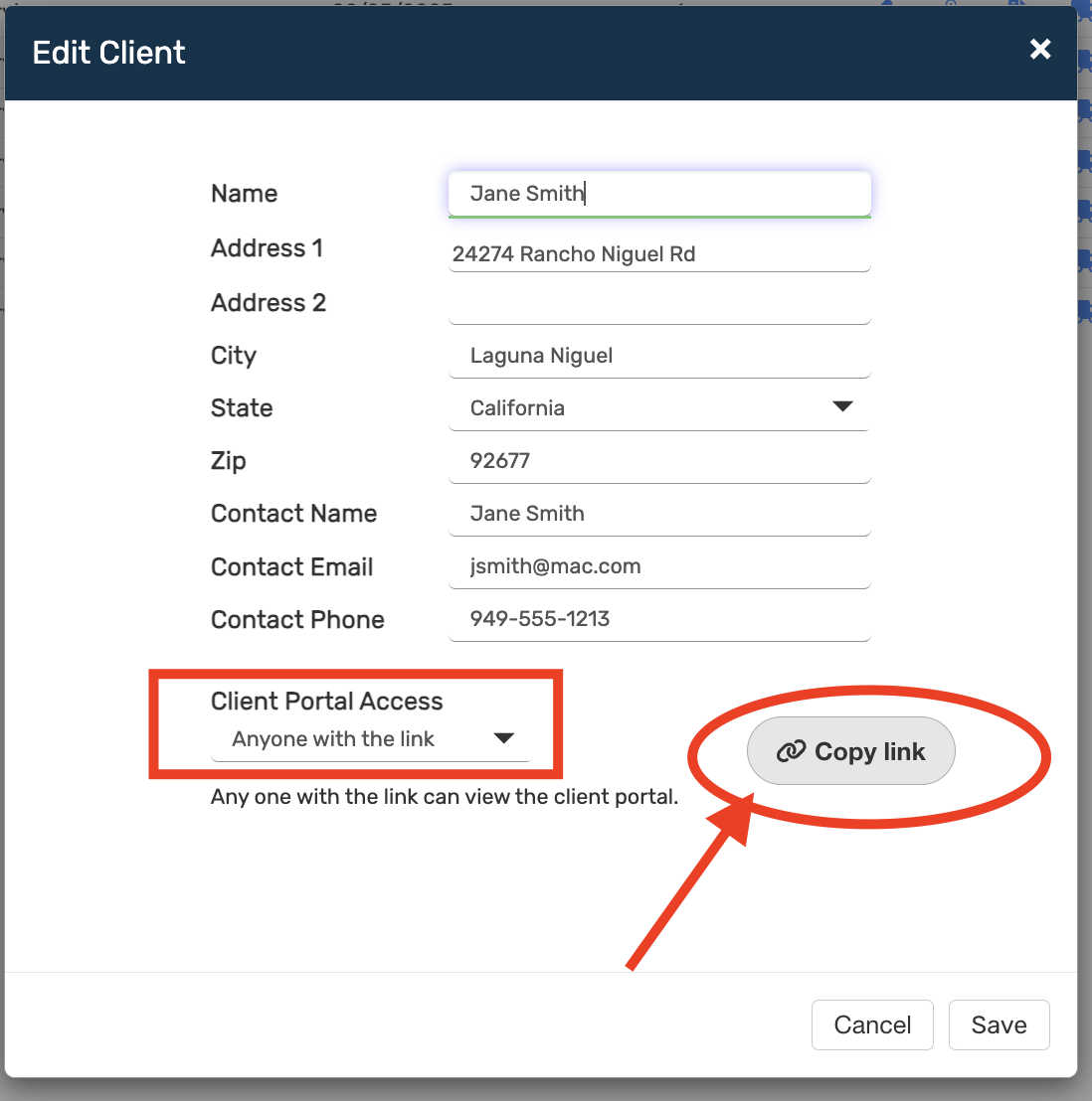 3. From the edit client window -- change Client Portal Access to "Anyone with the link". Next, click on "Copy Link".