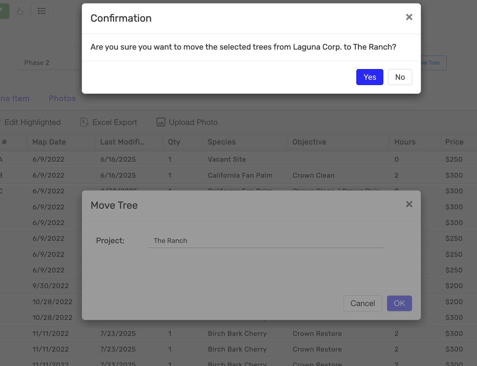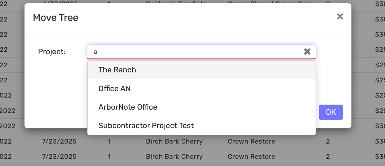 - In the pop up window, enter the name of the new destination project to move selected trees to.