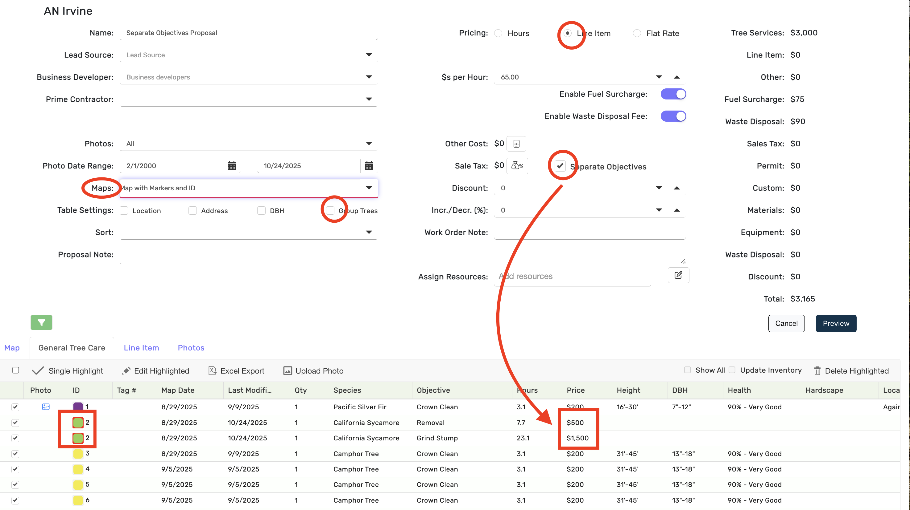- Select "Map with Markers and ID#s" for map option.Select the "Separate Objectives" box. -- selecting this box will create a line item for objective/service assigned to that tree. In the example below Tree ID#2 now has two line items that can be edited to add separate pricing for the removal and grind.