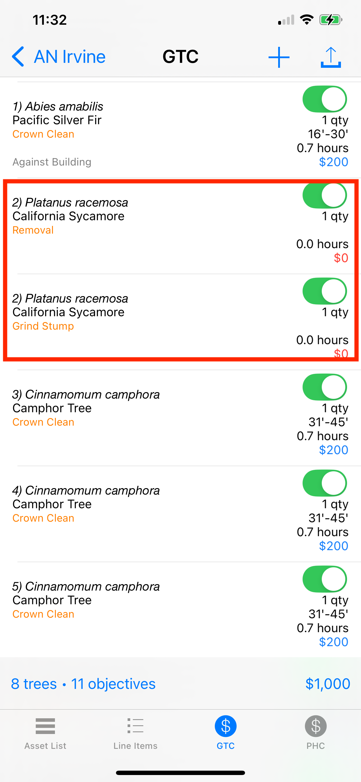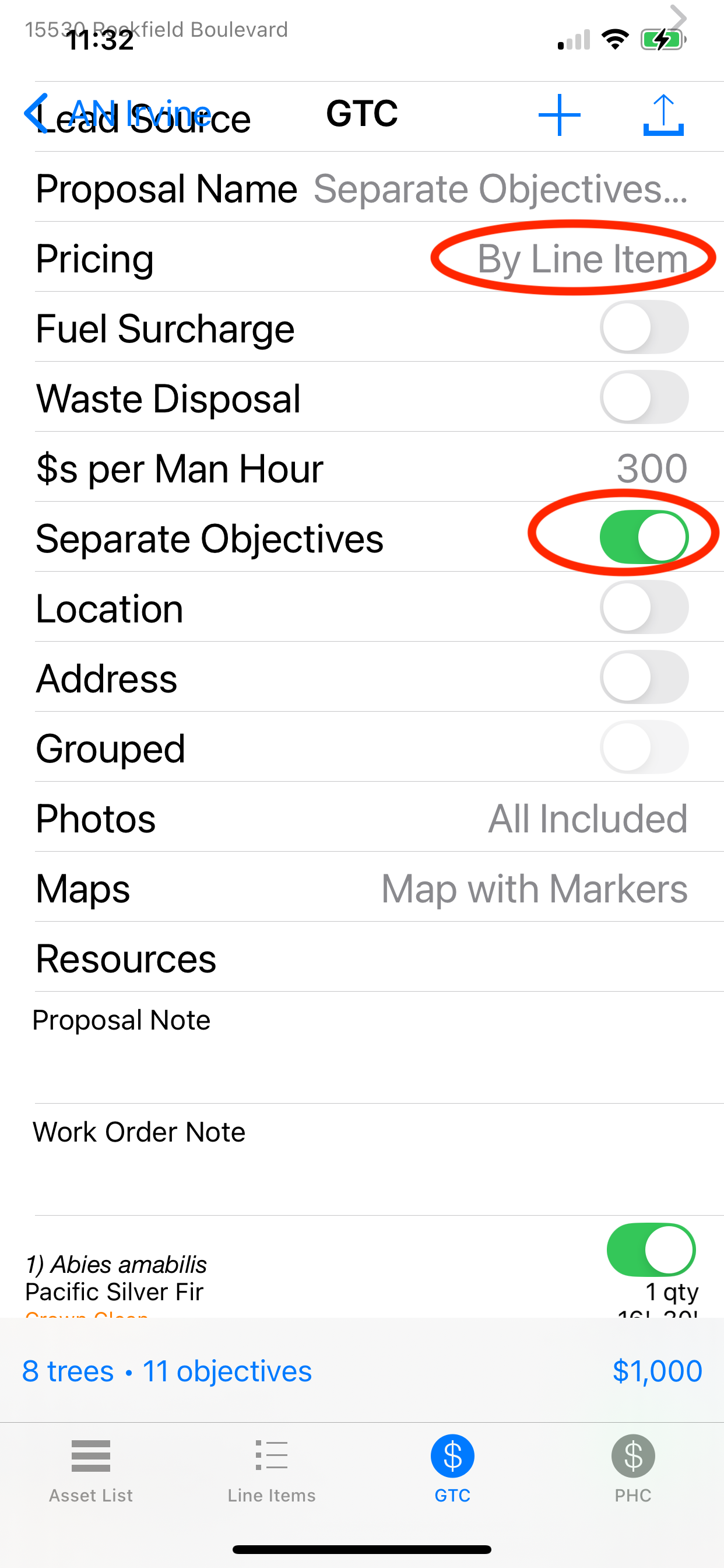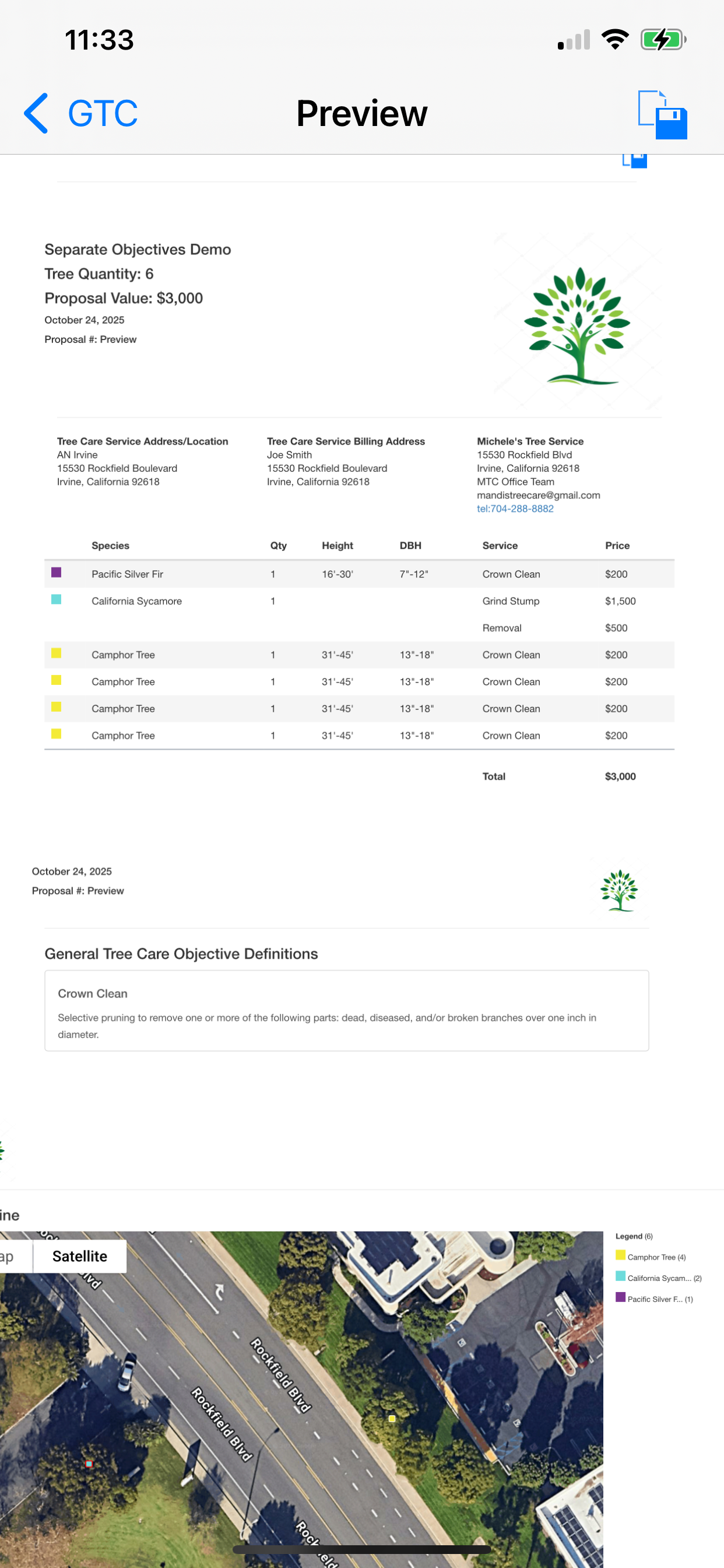 3. Create your proposal as usual and you will see the line items separated like in the proposal example below. Note: You can select Map option "Map with Markers and ID numbers" to display each trees id#.