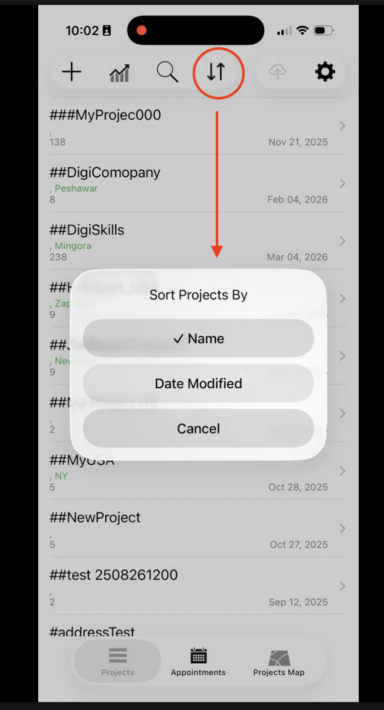 Use the new arrows icon to sort project list by: